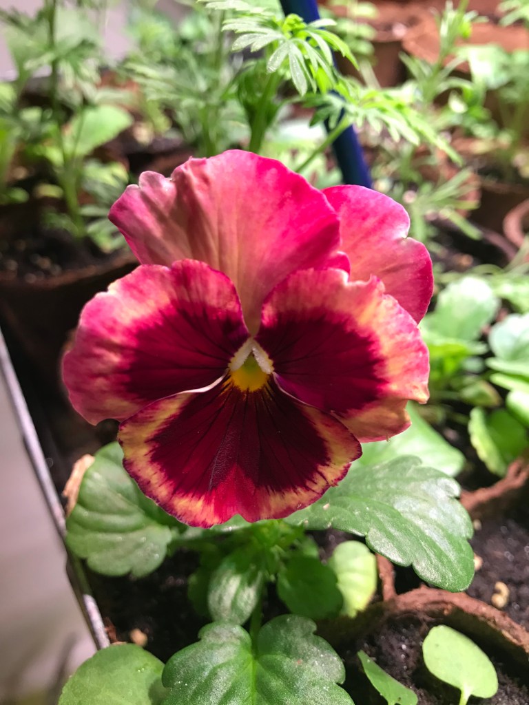 Es war kurz vor dem Brexit, als es noch keine Probleme mit Saatgutbestellungen aus England gab. Draussen war es trüb und grau und auf einmal sahen all die knallbunten britischen Züchtungen unglaublich anziehend aus – sogar die Stiefmütterchen. Und ehe ich mich’s versah, lag so ein zuckersüsses Pansy-Ding im Warenkorb. Was man kauft, muss man auch ansäen und so wuchsen in meinem Zimmergewächshaus neben Mehlsalbei, Lavendel und Echinacea halt auch ein paar Stiefmütterchen heran. Eines dieser Pflänzchen stellte sich als besonders ambitioniert heraus, es öffnete seine erste Blüte bereits, als draussen noch Schnee lag.